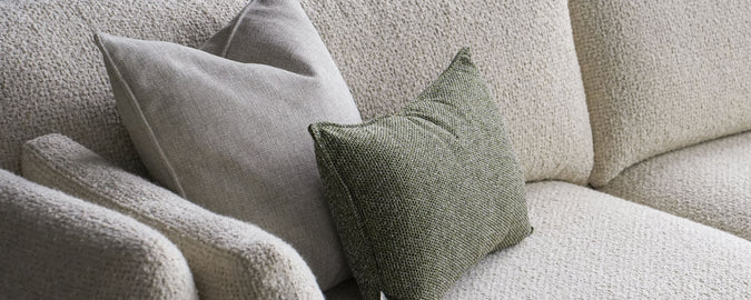 Soft textured cushions in neutral and green tones, adding comfort and style to seating arrangements.